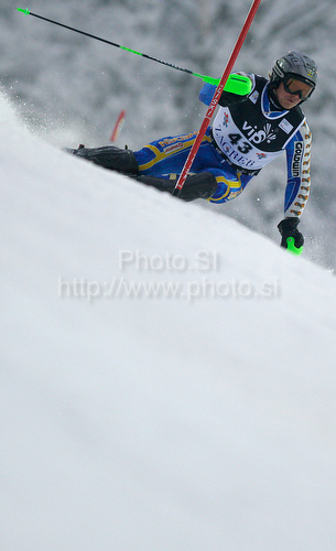 : Jens Byggmark of Sweden skiing in first run of men Snow queen trophy slalom World Cup race in Zagreb, Croatia. Slalom race of Men Audi FIS Alpine skiing World Cup 2009-10 was held on Sljeme above Zagreb, Croatia, on 6th of January 2010.