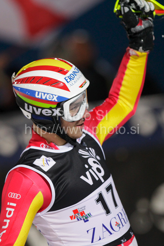 : Felix Neureuther of Germany reacts in finish of second run of men Snow queen trophy slalom World Cup race in Zagreb, Croatia. Slalom race of Men Audi FIS Alpine skiing World Cup 2009-10 was held on Sljeme above Zagreb, Croatia, on 6th of January 2010.