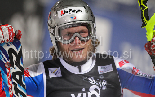 Zagreb ,Croatia - 06.01.2010 : Third placed Julien Lizeroux of France reacts in finish of second run of men Snow queen trophy slalom World Cup race in Zagreb, Croatia. Slalom race of Men Audi FIS Alpine skiing World Cup 2009-10 was held on Sljeme above Zagreb, Croatia, on 6th of January 2010. Photo by: Primoz Jeroncic