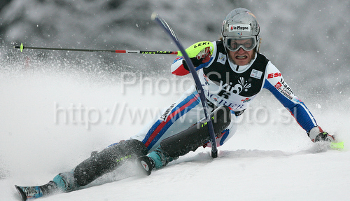 : Julien Lizeroux of France skiing in first run of men Snow queen trophy slalom World Cup race in Zagreb, Croatia. Slalom race of Men Audi FIS Alpine skiing World Cup 2009-10 was held on Sljeme above Zagreb, Croatia, on 6th of January 2010.