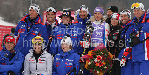 : Third placed Ingrid Jacquemod of France celebrates her medal with her team after women downhill race of Audi FIS alpine skiing World Cup in Haus im Ennstal, Austria. Downhill race of Women Audi FIS Alpine skiing World Cup 2009-10 was held in Haus im Ennstal, Austria, on 9th of January 2010.