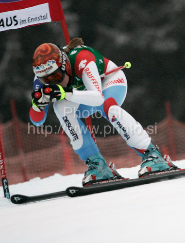 : Third placed Martina Schild of Switzerland skiing during women Super-G race of Audi FIS alpine skiing World Cup in Haus im Ennstal, Austria. Super-G race of Women Audi FIS Alpine skiing World Cup 2009-10 was held in Haus im Ennstal, Austria, on 10th of January 2010.