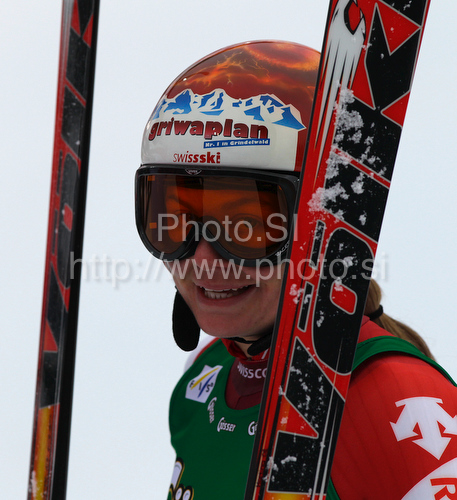 : Third placed Martina Schild of Switzerland reacts in finish of women Super-G race of Audi FIS alpine skiing World Cup in Haus im Ennstal, Austria. Super-G race of Women Audi FIS Alpine skiing World Cup 2009-10 was held in Haus im Ennstal, Austria, on 10th of January 2010.