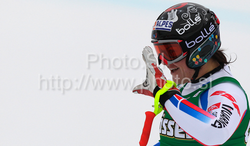 : reacts in finish of women Super-G race of Audi FIS alpine skiing World Cup in Haus im Ennstal, Austria. Super-G race of Women Audi FIS Alpine skiing World Cup 2009-10 was held in Haus im Ennstal, Austria, on 10th of January 2010.