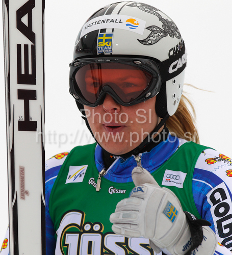 : Second placed Anja Paerson of Sweden reacts in finish of women Super-G race of Audi FIS alpine skiing World Cup in Haus im Ennstal, Austria. Super-G race of Women Audi FIS Alpine skiing World Cup 2009-10 was held in Haus im Ennstal, Austria, on 10th of January 2010.