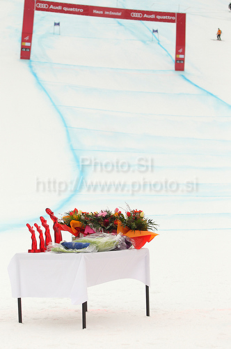 : Victory trophies in finish of women Super-G race of Audi FIS alpine skiing World Cup in Haus im Ennstal, Austria. Super-G race of Women Audi FIS Alpine skiing World Cup 2009-10 was held in Haus im Ennstal, Austria, on 10th of January 2010.