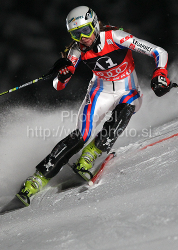 : Sandrine Aubert of France skiing in first run of Women slalom race of Audi FIS alpine skiing World Cup in Flachau, Austria. Slalom race of Women Audi FIS Alpine skiing World Cup 2009-10 was held in Flachau, Austria, on 12th of January 2010.