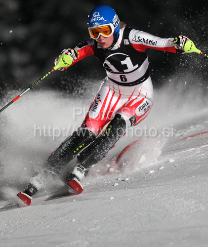 : Fifth after first run Marlies Schild of Austria skiing in first run of Women slalom race of Audi FIS alpine skiing World Cup in Flachau, Austria. Slalom race of Women Audi FIS Alpine skiing World Cup 2009-10 was held in Flachau, Austria, on 12th of January 2010.