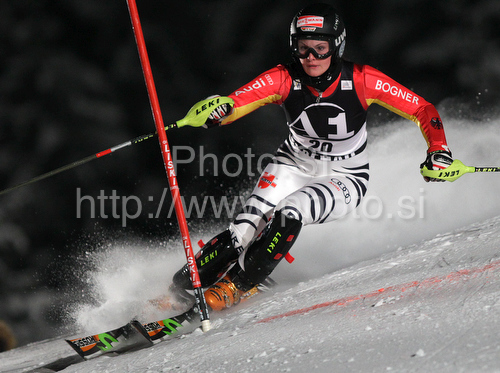 : Christina Geiger of Germany skiing in first run of Women slalom race of Audi FIS alpine skiing World Cup in Flachau, Austria. Slalom race of Women Audi FIS Alpine skiing World Cup 2009-10 was held in Flachau, Austria, on 12th of January 2010.