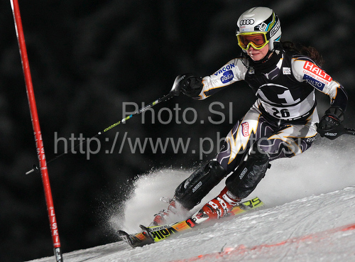 : Sanni Leinonen of Finland skiing in first run of Women slalom race of Audi FIS alpine skiing World Cup in Flachau, Austria. Slalom race of Women Audi FIS Alpine skiing World Cup 2009-10 was held in Flachau, Austria, on 12th of January 2010.