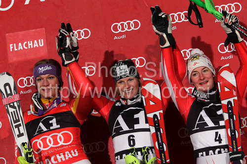 : Winner Marlies Schild of Austria (M), second placed Maria Riesch of Germany (L) and third placed Kathrin Zettel of Austria (R) celebrate their medals won in Women slalom race of Audi FIS alpine skiing World Cup in Flachau, Austria. Slalom race of Women Audi FIS Alpine skiing World Cup 2009-10 was held in Flachau, Austria, on 12th of January 2010.