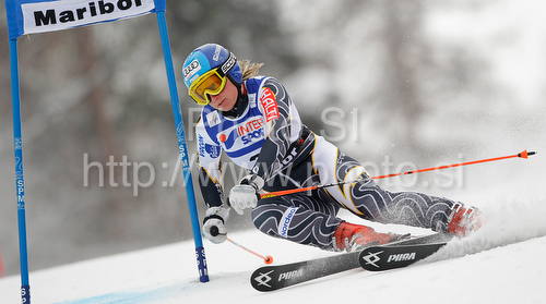 : Tanja Poutiainen of Finland skiing in first run of Women giant slalom race of Audi FIS alpine skiing World Cup in Maribor, Slovenia. Giant slalom race of Women Audi FIS Alpine skiing World Cup 2009-10 was held in Maribor, Slovenia, on 16th of January 2010.