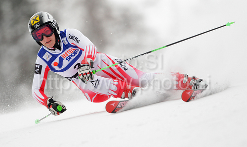 : Leader after first run Kathrin Zettel of Austria skiing in first run of Women giant slalom race of Audi FIS alpine skiing World Cup in Maribor, Slovenia. Giant slalom race of Women Audi FIS Alpine skiing World Cup 2009-10 was held in Maribor, Slovenia, on 16th of January 2010.