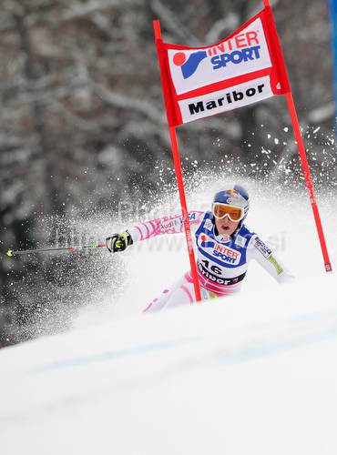 : Second after first run Lindsey Vonn of USA skiing in first run of Women giant slalom race of Audi FIS alpine skiing World Cup in Maribor, Slovenia. Giant slalom race of Women Audi FIS Alpine skiing World Cup 2009-10 was held in Maribor, Slovenia, on 16th of January 2010.