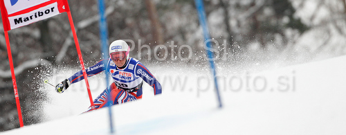 : Chemmy Alcott of Great Britain skiing in first run of Women giant slalom race of Audi FIS alpine skiing World Cup in Maribor, Slovenia. Giant slalom race of Women Audi FIS Alpine skiing World Cup 2009-10 was held in Maribor, Slovenia, on 16th of January 2010.