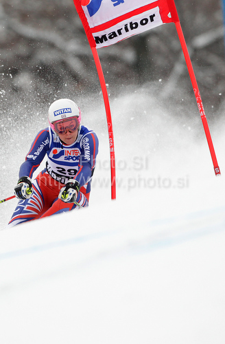 : Chemmy Alcott of Great Britain skiing in first run of Women giant slalom race of Audi FIS alpine skiing World Cup in Maribor, Slovenia. Giant slalom race of Women Audi FIS Alpine skiing World Cup 2009-10 was held in Maribor, Slovenia, on 16th of January 2010.