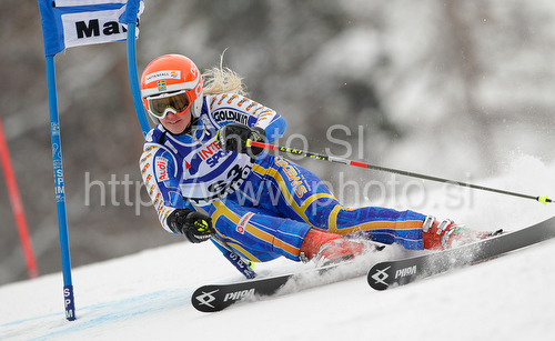 : Emelie Wikstroem of Sweden skiing in first run of Women giant slalom race of Audi FIS alpine skiing World Cup in Maribor, Slovenia. Giant slalom race of Women Audi FIS Alpine skiing World Cup 2009-10 was held in Maribor, Slovenia, on 16th of January 2010.