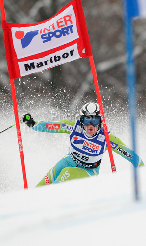 : Marusa Ferk of Slovenia skiing in first run of Women giant slalom race of Audi FIS alpine skiing World Cup in Maribor, Slovenia. Giant slalom race of Women Audi FIS Alpine skiing World Cup 2009-10 was held in Maribor, Slovenia, on 16th of January 2010.