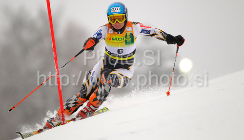: Seventh placed after first run Tanja Poutiainen of Finland skiing in first run of Women slalom race of Audi FIS alpine skiing World Cup in Maribor, Slovenia. Slalom race of Women Audi FIS Alpine skiing World Cup 2009-10 was held in Maribor, Slovenia, on 17th of January 2010.