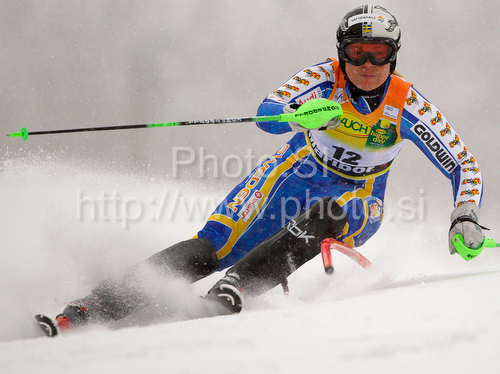 : Anja Paerson of Sweden skiing in first run of Women slalom race of Audi FIS alpine skiing World Cup in Maribor, Slovenia. Slalom race of Women Audi FIS Alpine skiing World Cup 2009-10 was held in Maribor, Slovenia, on 17th of January 2010.