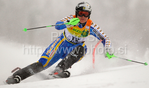 : Anja Paerson of Sweden skiing in first run of Women slalom race of Audi FIS alpine skiing World Cup in Maribor, Slovenia. Slalom race of Women Audi FIS Alpine skiing World Cup 2009-10 was held in Maribor, Slovenia, on 17th of January 2010.