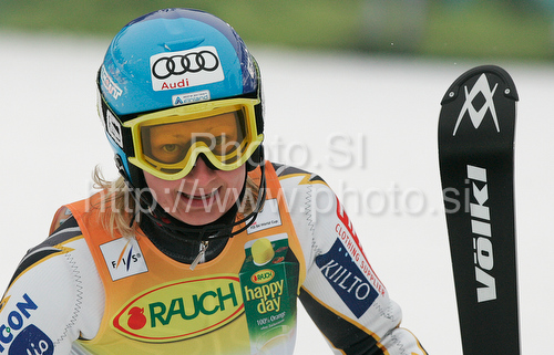 : Tanja Poutiainen of Finland reacts in finish of first run of Women slalom race of Audi FIS alpine skiing World Cup in Maribor, Slovenia. Slalom race of Women Audi FIS Alpine skiing World Cup 2009-10 was held in Maribor, Slovenia, on 17th of January 2010.