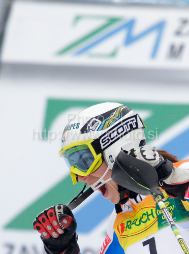 : Fifth placed Sandrine Aubert of France reacts in finish of second run of Women slalom race of Audi FIS alpine skiing World Cup in Maribor, Slovenia. Slalom race of Women Audi FIS Alpine skiing World Cup 2009-10 was held in Maribor, Slovenia, on 17th of January 2010.