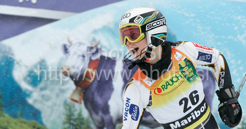 : Seventh placed Sanni Leinonen of Finland reacts in finish of second run of Women slalom race of Audi FIS alpine skiing World Cup in Maribor, Slovenia. Slalom race of Women Audi FIS Alpine skiing World Cup 2009-10 was held in Maribor, Slovenia, on 17th of January 2010.