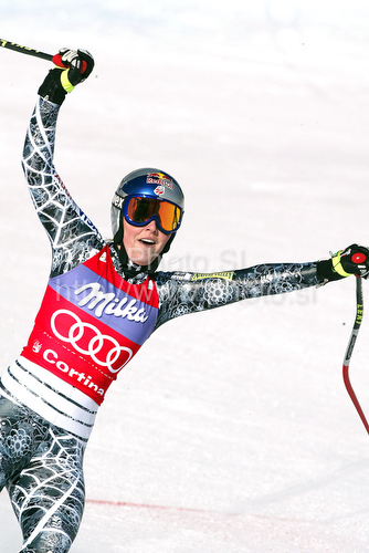 : Lindsey Vonn of the United States reacts after taking first placed during the womens Ski World Cup Downhill race in Cortina d Ampezzo, Italy, Saturday, January 23, 2010.