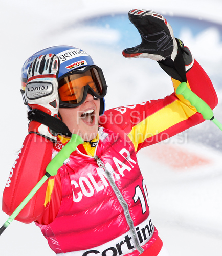 : Viktoria Rebensburg of Germany recats after placing second in the womens alpine ski World Cup Giant Slalom race in Cortina dAmpezzo, Italy, Sunday, January 24, 2010.
