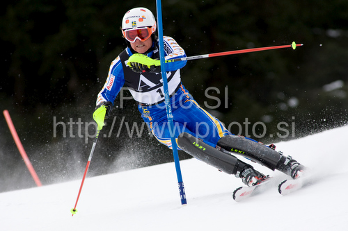 : Mattias Hargin (SWE) attacks a control gate while competing in the mens Hahnenkamm slalom race part of the 70th Hahnenkamm Rennen race weekend, which is a fixture on the 2009/10 Audi FIS Alpine Skiing World Cup. Slalom race of men Audi FIS Alpine skiing World cup was held in Kitzbuhel, Austria, on 24th of January 2010.