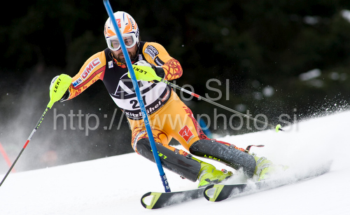 : Julien Cousineau (CAN) attacks a control gate while competing in the mens Hahnenkamm slalom race part of the 70th Hahnenkamm Rennen race weekend, which is a fixture on the 2009/10 Audi FIS Alpine Skiing World Cup. Slalom race of men Audi FIS Alpine skiing World cup was held in Kitzbuhel, Austria, on 24th of January 2010.