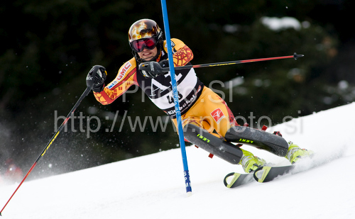 : Trevor White (CAN) attacks a control gate while competing in the mens Hahnenkamm slalom race part of the 70th Hahnenkamm Rennen race weekend, which is a fixture on the 2009/10 Audi FIS Alpine Skiing World Cup. Slalom race of men Audi FIS Alpine skiing World cup was held in Kitzbuhel, Austria, on 24th of January 2010.
