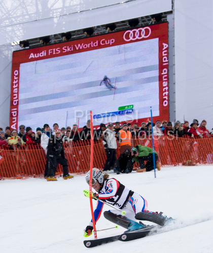: Julien Lizeroux (FRA) attacks a control gate while competing in the mens Hahnenkamm slalom race part of the 70th Hahnenkamm Rennen race weekend, which is a fixture on the 2009/10 Audi FIS Alpine Skiing World Cup. Slalom race of men Audi FIS Alpine skiing World cup was held in Kitzbuhel, Austria, on 24th of January 2010.