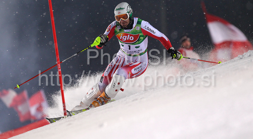 : Leader after first run Manfred Pranger of Austria skiing in first run of Men Night slalom race of Audi FIS alpine skiing World Cup in Schladming, Austria. Slalom race of Men Audi FIS Alpine skiing World Cup 2009-10 was held in Schladming, Austria, on 26th of January 2010.