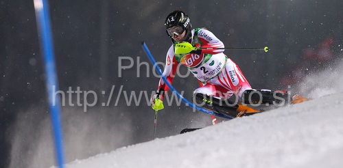 : Second after first run Reinfried Herbst of Austria skiing in first run of Men Night slalom race of Audi FIS alpine skiing World Cup in Schladming, Austria. Slalom race of Men Audi FIS Alpine skiing World Cup 2009-10 was held in Schladming, Austria, on 26th of January 2010.