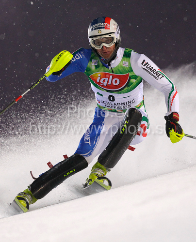 : Fifth after first run Manfred Moelgg of Italy skiing in first run of Men Night slalom race of Audi FIS alpine skiing World Cup in Schladming, Austria. Slalom race of Men Audi FIS Alpine skiing World Cup 2009-10 was held in Schladming, Austria, on 26th of January 2010.