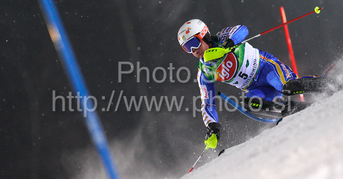 : Ninth after first run Mattias Hargin of Sweden skiing in first run of Men Night slalom race of Audi FIS alpine skiing World Cup in Schladming, Austria. Slalom race of Men Audi FIS Alpine skiing World Cup 2009-10 was held in Schladming, Austria, on 26th of January 2010.