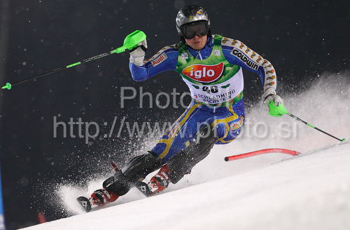 : Jens Byggmark of Sweden skiing in first run of Men Night slalom race of Audi FIS alpine skiing World Cup in Schladming, Austria. Slalom race of Men Audi FIS Alpine skiing World Cup 2009-10 was held in Schladming, Austria, on 26th of January 2010.
