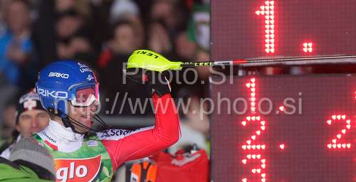 : Fourth placed Benjamin Raich of Austria reacts in finish of second run of Men Night slalom race of Audi FIS alpine skiing World Cup in Schladming, Austria. Slalom race of Men Audi FIS Alpine skiing World Cup 2009-10 was held in Schladming, Austria, on 26th of January 2010.