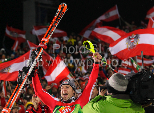 Schladming ,Austria - 26.01.2010 : Winner Reinfried Herbst of Austria celebrates his medal won in Men Night slalom race of Audi FIS alpine skiing World Cup in Schladming, Austria. Slalom race of Men Audi FIS Alpine skiing World Cup 2009-10 was held in Schladming, Austria, on 26th of January 2010. Photo by: Primoz Jeroncic