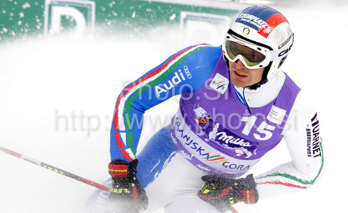 : Eight placed Manfred Moelgg of Italy reacts in finish of second run of Men giant slalom race of Audi FIS alpine skiing World Cup in Kranjska Gora, Slovenia. Giant slalom race of Men Audi FIS Alpine skiing World Cup 2009-10, which substituted canceled giant slalom race from Adelboden, Switzerland, was held on Friday in Kranjska Gora, Slovenia, on 29th of January 2010.