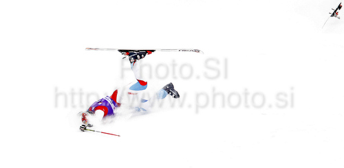 : Didier Cuche of Switzerland crashes in second run of Men giant slalom race of Audi FIS alpine skiing World Cup in Kranjska Gora, Slovenia. Giant slalom race of Men Audi FIS Alpine skiing World Cup 2009-10, which substituted canceled giant slalom race from Adelboden, Switzerland, was held on Friday in Kranjska Gora, Slovenia, on 29th of January 2010.