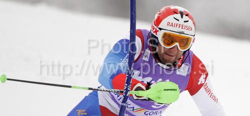 : Sixth after first run Silvan Zurbriggen of Switzerland skiing in first run of Men slalom race of Audi FIS alpine skiing World Cup in Kranjska Gora, Slovenia. Slalom race of Men Audi FIS Alpine skiing World Cup 2009-10, was held on Sunday in Kranjska Gora, Slovenia, on 31st of January 2010.