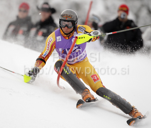 : Fourth after first run Michael Janyk of Canada skiing in first run of Men slalom race of Audi FIS alpine skiing World Cup in Kranjska Gora, Slovenia. Slalom race of Men Audi FIS Alpine skiing World Cup 2009-10, was held on Sunday in Kranjska Gora, Slovenia, on 31st of January 2010.