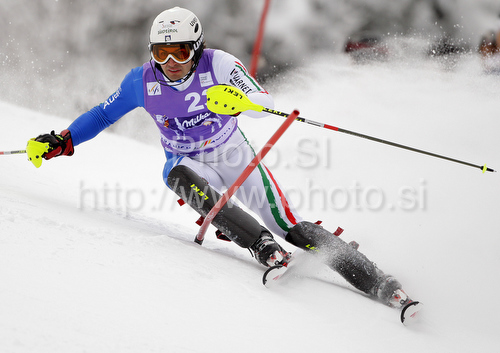: Patrick Thaler of Italy skiing in first run of Men slalom race of Audi FIS alpine skiing World Cup in Kranjska Gora, Slovenia. Slalom race of Men Audi FIS Alpine skiing World Cup 2009-10, was held on Sunday in Kranjska Gora, Slovenia, on 31st of January 2010.