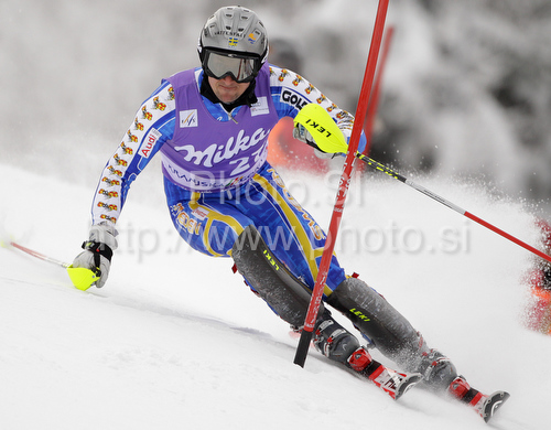 : Markus Larsson of Sweden skiing in first run of Men slalom race of Audi FIS alpine skiing World Cup in Kranjska Gora, Slovenia. Slalom race of Men Audi FIS Alpine skiing World Cup 2009-10, was held on Sunday in Kranjska Gora, Slovenia, on 31st of January 2010.