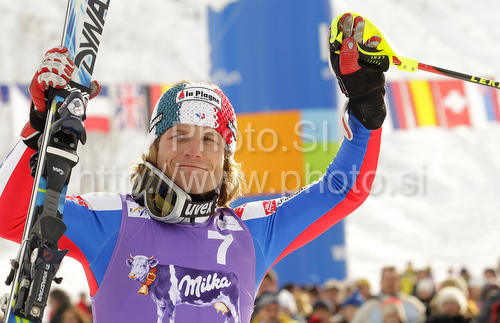 : Third placed Julien Lizeroux of France celebrates his medal won in Men slalom race of Audi FIS alpine skiing World Cup in Kranjska Gora, Slovenia. Slalom race of Men Audi FIS Alpine skiing World Cup 2009-10, was held on Sunday in Kranjska Gora, Slovenia, on 31st of January 2010.