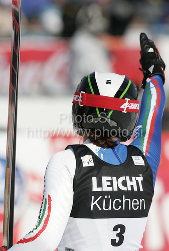 : Johanna Schnarf of Italy reacts in finish of Women downhill race of Audi FIS alpine skiing World Cup in Garmisch-Partenkirchen, Germany. Training for downhill race of Men Audi FIS Alpine skiing World Cup 2009-10, was held on Tuesday in Garmisch-Partenkirchen, Germany, on 9th of March 2010.