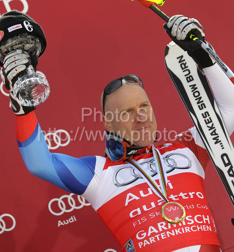: Winner Didier Cuche of Switzerland celebrates overall Downhill World cup victory after last Men downhill race of Audi FIS alpine skiing World Cup, which was held on Kandahar downhill course in Garmisch-Partenkirchen, Germany. Last downhill race of Men Audi FIS Alpine skiing World Cup 2009-10, was held on Wednesday, 10th of March 2010 in Garmisch-Partenkirchen, Germany.